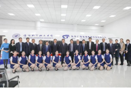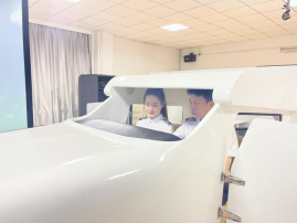 航空服务实训中心位于航宇馆106室,2020年9月建成并投入使用,占地面积440余平方米,设备总值400余万元。中心拥有空客A330飞机双通道模拟舱一架,全长16.81米、宽5.64米、高2.7米,按空客A330飞机1:1对应复制带机身舱段和驾驶舱的模拟设备,有效还原了真实的客舱,可用于学员熟悉飞机客舱布局、机载设备操作、餐饮服务、应急处置等专业的实践教学,是目前国内高校航空服务艺术与管理专业最先进的教学设施设备。