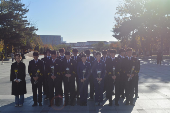 默哀完毕全体师生伫立在烈士纪念碑前,依次献上承载着敬意的鲜花。一枝枝花朵化作一缕缕哀思,传达了民航学子对先烈无声的敬畏与哀悼。